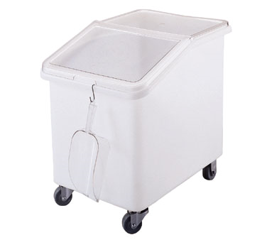 IBS37148 Ingredient Bin, mobile, 37 gallon capacity, 1-pc seamless polyethylene bin, 2-pc sliding polycarbonate lid, S-hook on front scoop NOT included, 4 3 heavy duty casters 2 front swivel, 2 fixed, white with clear cover, NSF